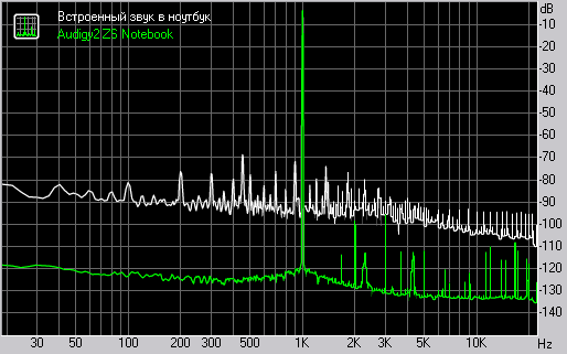Параметр Сигнал/Шум заявлен как 104 дБ, при тестировании через профессиональный интерфейс E-MU1616m (118 дБА в собственном loop) получилось 102 дБА, это очень хороший результат для ноутбучной карты. Сам по себе параметр не говорит ничего о качестве звучания, но косвенно показывает, что начинка карты довольно близка к PCI линейке Audigy2, которые могут выдать (в конфигурации с качественным питанием) до 109 дБА. У встроенного звука Intel 82801 BA в данном ноутбуке в тех же условиях всего 63 дБА.