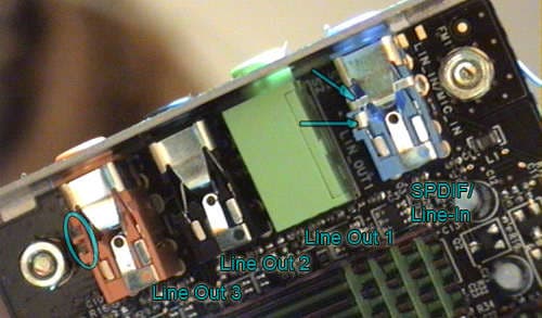 3, 4. Гнездо Line Out 2, Line Out 3. Два четырехконтактных выхода в фирменной распайке Creative — очень неудобное решение. Попробуйте найти такие переходники за разумную цену или спаять сами. Как вы догадались, 2-е гнездо отвечает за фронтальные, а 3+4 за остальные шесть каналов. При этом для режимов 6.1, 7.1 переходники обязательны. Для 5.1 режима подойдут стандартные стерео-миниджеки.