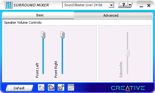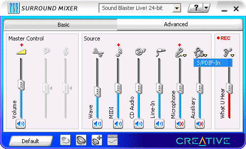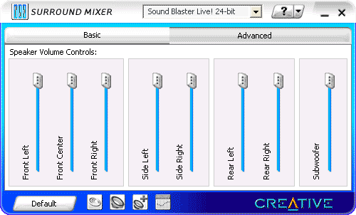 Creative Surround Mixer — стандартный микшер, в котором заблокированы и не работают тембры высоких и низких частот. Крайне необдуманно сделаны громкости линейных и цифрового входов — всего 3 ползунка, один под Line-in, а два под Mic, S/PDIF-in и Auxliary. Из них одного никогда не видно, его нужно менять с каким-нибудь другим, что очень неудобно. Так сделано, скорее всего, из-за ограничения конструкции АЦП. Похоже, аналоговый микшер АЦП может выбирать только один источник, но не может менять и смешивать уровни сигнала. Возможно, для скрытия этого недостатка и сделана путаница с выбором линейных входов, реально только один из них можно включить на прослушивание. Помимо этого микшера есть два дополнительных аналоговых входа. В схеме сначала идет Input Mixer переключающий аналоговые входы, один из дополнительных входов отдан под LinE-in, а другой — под Wave для записи What U hear. Также есть отдельный моно-вход от микрофона. В разделе Запись (REC) присутствует полезная функция "Do not monitor".