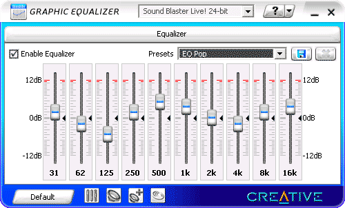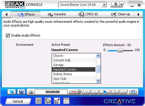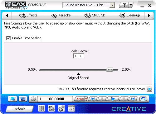 Последняя вкладка панели EAX — Time Scaling. Убыстрение и замедление звука. Качество, на мой взгляд, очень низкое… Работает только под Creative MediaSourse Player. А теперь о веселом — ставим по умолчанию звуковую карту Prodigy7.1, запускаем фирменный проигрыватель от Creative MediaSourse Player и музыку, включив настройки EAX. Эффекты реверберации EAX не работают. А вот CMSS, Clean-up, Караоке (Voice Suppression amount и Pitch) и Time Scaling под Prodigy7.1 исправно работает. Делаем вывод — Караоке (Voice Suppression amount и Pitch) и Time Scaling — программные плагины исключительно Creative MediaSourse Player и к карте отношения не имеют. Однако если вынуть из компа Live! 24-bit, то Windows начнет ругаться, что не может найти EAX, какие-то библиотеки работать не хотят, а в Creative MediaSourse Player пропадут кнопочки для EAX, EQ и многое другое.