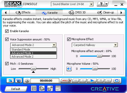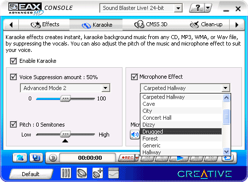 Караоке — дань моде… Эта функция есть и на встроенной Realtek ALC650. Хотя здесь настроек больше, плюс можно наложить эффект на микрофон. Работает несколько ущербно. Левая часть Voice Suppression amount и Pitch работают только с Creative MediaSourse Player. Включение/отключение эффекта требует примерно 5 секунд задержки. На голосовое подавление — 3 разных режима, из них два с регулировкой. Pitch меняет тон мелодии. На ревербацию, накладываемую на микрофон, доступно огромное количество пресетов. Для того чтобы ее услышать, нужно выбрать микрофон на запись (что панель делает автоматически), а в source микрофон отключить. Включение/отключение эффекта мгновенно. Вместо микрофона Line-in или Auxliary подставить не удалось.