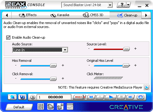 А вот что по настоящему интересно — Clean-up. Убираем шумы и щелчки с аудио записи. Изначально это предлагается использовать для винила, но дома это пригодится для FM-тюнера. Включение/отключение эффекта требует примерно 7 секунд задержки. Работает под любым плеером. В теории можно это накладывать на Media Files и на линейные входы. На практике — микрофон и Line-in, а Auxiliary, несмотря на возможность выбора, не обрабатывался. Работает очень эффективно. Это единственное, что переплюнуло NSP. Конечно, если поднапрячься, и поискать по интернету, то можно достать необходимый VST-плагин, но на данный момент у меня такого нет. И за Clean-up поставим карточке большой плюс!