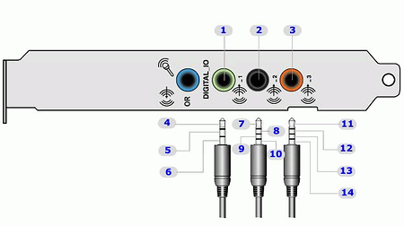 1. Гнездо линейного входа/микрофонного + входа/цифрового ввода-вывода (DIGITAL_IO). Хитрый нестандартный четырехконтактный разъем — очередная мелкая гадость в стиле Creative. Для цифры предлагается использовать модуль цифровых входов/выходов (номер модели SB002).