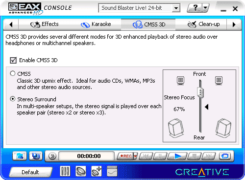 CMSS 3D — разложение стерео на все каналы. То же самое, что и QMSS, вшитая в последние дрова Prodigy7.1, или QMSS в программе QMax-2, которая стоит $25 и ставится на любую карту. CMSS работает под любым плеером. На линейные входы не распространяется. В режиме стерео (2.0) этот эффект работает как расширитель стереобазы. На обычной акустике звучит неплохо, а вот звучание в наушниках в одноимённом режиме мне не понравилось. Ощущение, что слушаешь в бочке. Так же добавляется слабый эффект ревербации, что иногда приводит к искажениям голосов. В многоканальном режиме доступен баланс "фронт-тыл".