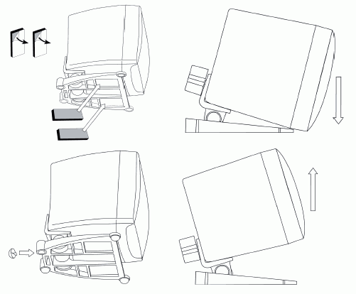 Предусмотрительность Creative заслуживает всяких похвал. Центральную колонку можно приклеить к верхней поверхности монитора или же поставить на стол перед монитором. В обоих случаях можно воспользоваться входящими в комплект самоклеющимися резинками. При этом наклон динамика имеет плавную регулировку на основе шарнира.