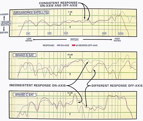 Так, в подтверждение равномерности звукового поля, излучаемого сателлитами, на упаковке комплекта мы можем видеть графики зависимости амплитуды от частоты, измеренные в двух положениях: на оси динамика и под углом к оси. Как видно, в области наиболее значимых частот АЧХ в двух этих случаях сливаются. При этом неравномерность составляет приемлемую величину — 7 дБ (в области средних частот и того меньше). Ниже приводятся ещё два графика для некоторых неназываемых моделей колонок — BRAND B SAT и BRAND C SAT. Нетрудно видеть, что там картина гораздо плачевнее: большая неравномерность и различная тембральная окраска звука при различном положении слушателя относительно колонок.