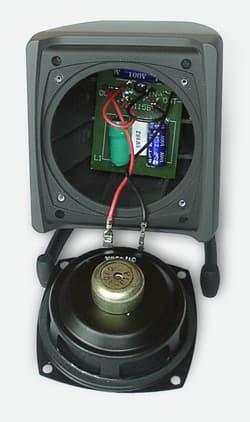 Внутри корпуса хорошо видна плата с распаянными на ней вышеупомянутыми элементами: 2 конденсаторами, дросселем и резистором. Для избежания паразитных призвуков весь объём внутри корпуса заполняет большое количество зукопоглощающего материала (не показано на фотографии).