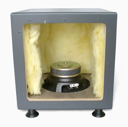 Толщина деревянных стенок сабвуфера составляет 1,5 см. В основании использована массивная плита толщиною 3 см. Стенки проложены толстым слоем звукопоглощающего материала (стекловата). Стыки хорошо загерметизированы, жесткость конструкции увеличена вклеенными уголками.