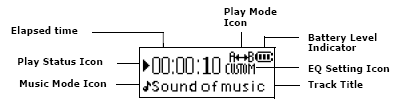Компактные размеры самого плеера не позволяют применить ЖКД большого размера, хотя имеющегося в принципе уже достаточно для управления при помощи меню, индикации текущего состояния устройства и отображения названия композиции. Дисплей полностью графический с синей подсветкой, но… мелковат. Впрочем, постоянно на него любоваться не нужно. Интересной особенностью является возможность поворота изображения на 180 градусов, что позволяет использовать плеер, как правшам, так и левшам (кстати, второе даже удобнее). Как говорит хорошая пословица: «Лучше один раз увидеть, чем сто раз услышать», так что просто приведу схему дисплея в режиме воспроизведения аудиофайлов: