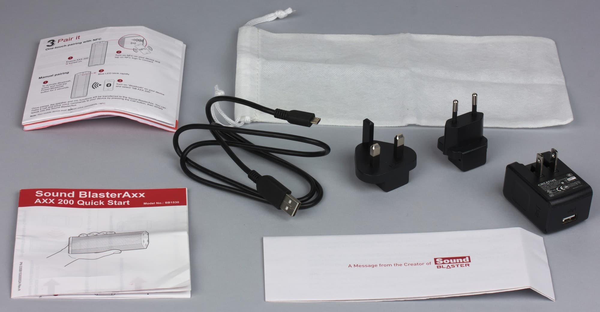 Комплект поставки акустической системы включает сетевой адаптер со сменными вилками, кабель Micro-USB и сопроводительные бумажки. А также простой белый мешочек для транспортировки устройства