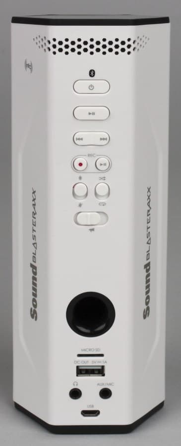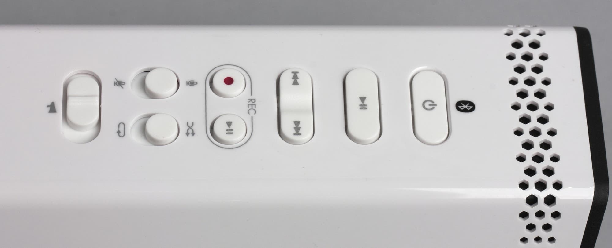 Тыловая грань шестиугольника содержит все элементы интерфейса акустической системы. За прорезью находится вторая пара микрофонов. Блок управления, отделенный от портов миниатюрным фазоинвертором, собрал в себе все кнопки: питание/bluetooth, воспроизведение/пауза, вперед/назад, запись и воспроизведение голоса, выключатель микрофона, ползунок режима воспроизведения и мегафона.