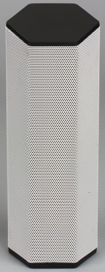 Динамики акустической системы расположены на двух фронтальных гранях, друг под другом. Сверху имеется пара микрофонов. Три маленькие точки внизу — это белые светодиоды, показывающие статус батареи.