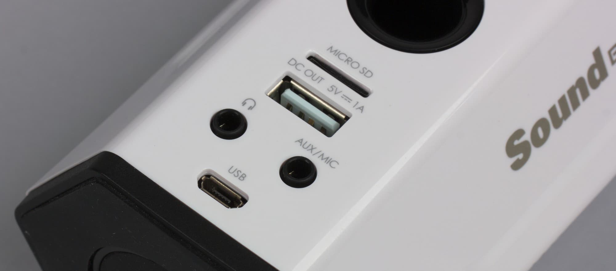 Под фазоинвертором находится слот microSD (поддерживающий карточки до 32 ГБ), порт для зарядки внешних устройств (5 В, 1 А), гнезда 3,5 мм для подключения наушников и микрофона, а также порт Micro-USB, с помощью которого акустическую систему можно не только зарядить, но и без проблем подключить к ПК.
