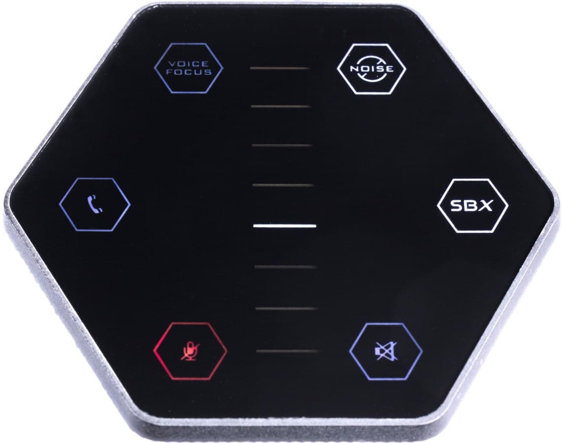 Для удобства черный сенсорный шестиугольник немного наклонен. Когда колонка включена, посередине подсвечивается шкала регулировки громкости, а в каждой вершине — по кнопке: приглушение микрофона и динамика, ответ на звонок, включение Voice Focus, шумоподавления и технологий обработки звука SBX