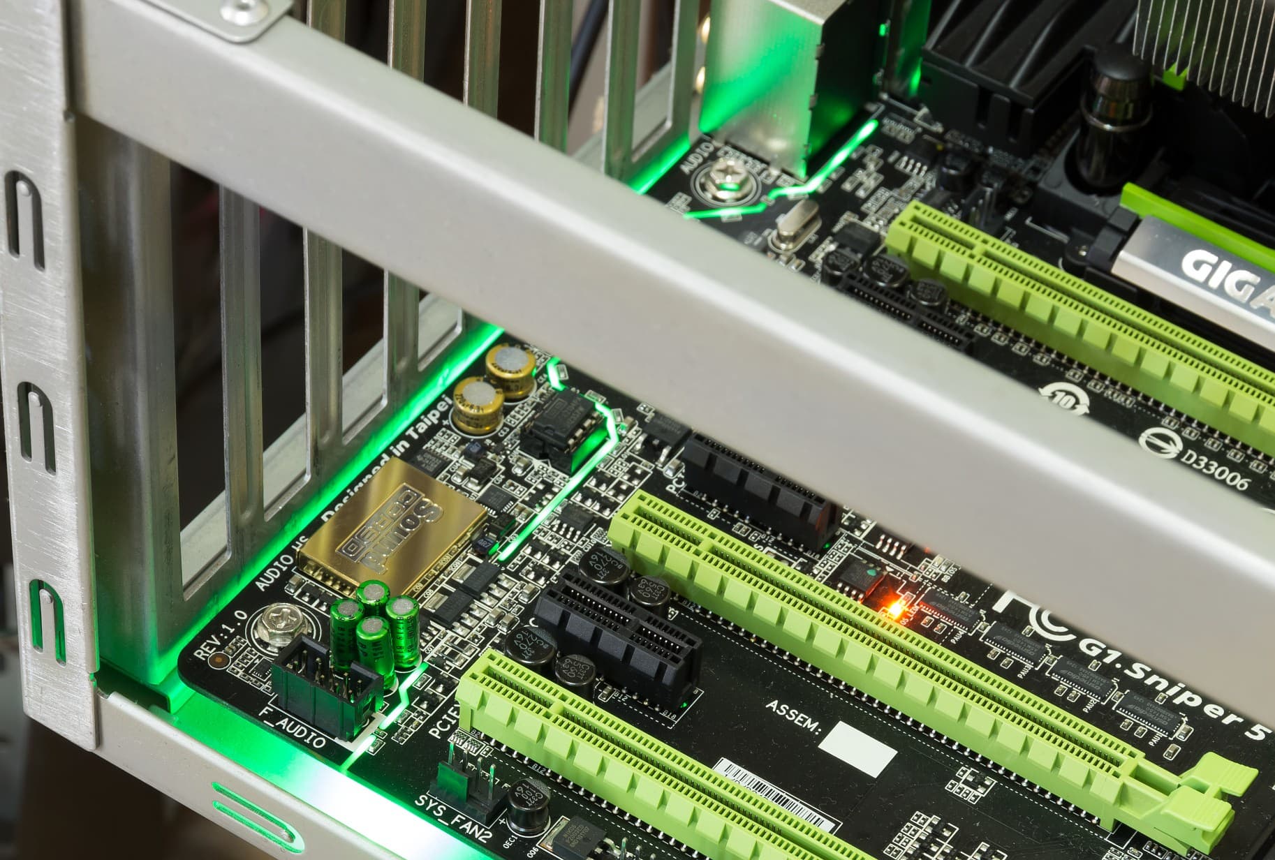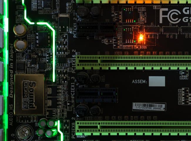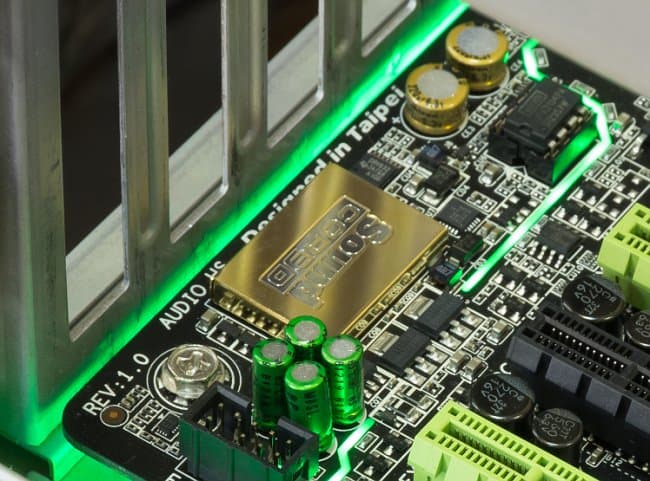 Чтобы лишний раз подчеркнуть все эти усилия, на плате сделана иллюминация: зеленая светящаяся в темноте линия показывает звуковую часть материнской платы. По всем признакам, это полноценная звуковая карта, встроенная в материнскую плату. Даже выходные разъемы миниджек сделаны позолоченными вместо привычных разноцветных пластмассовых разъемов интегрированного звука.