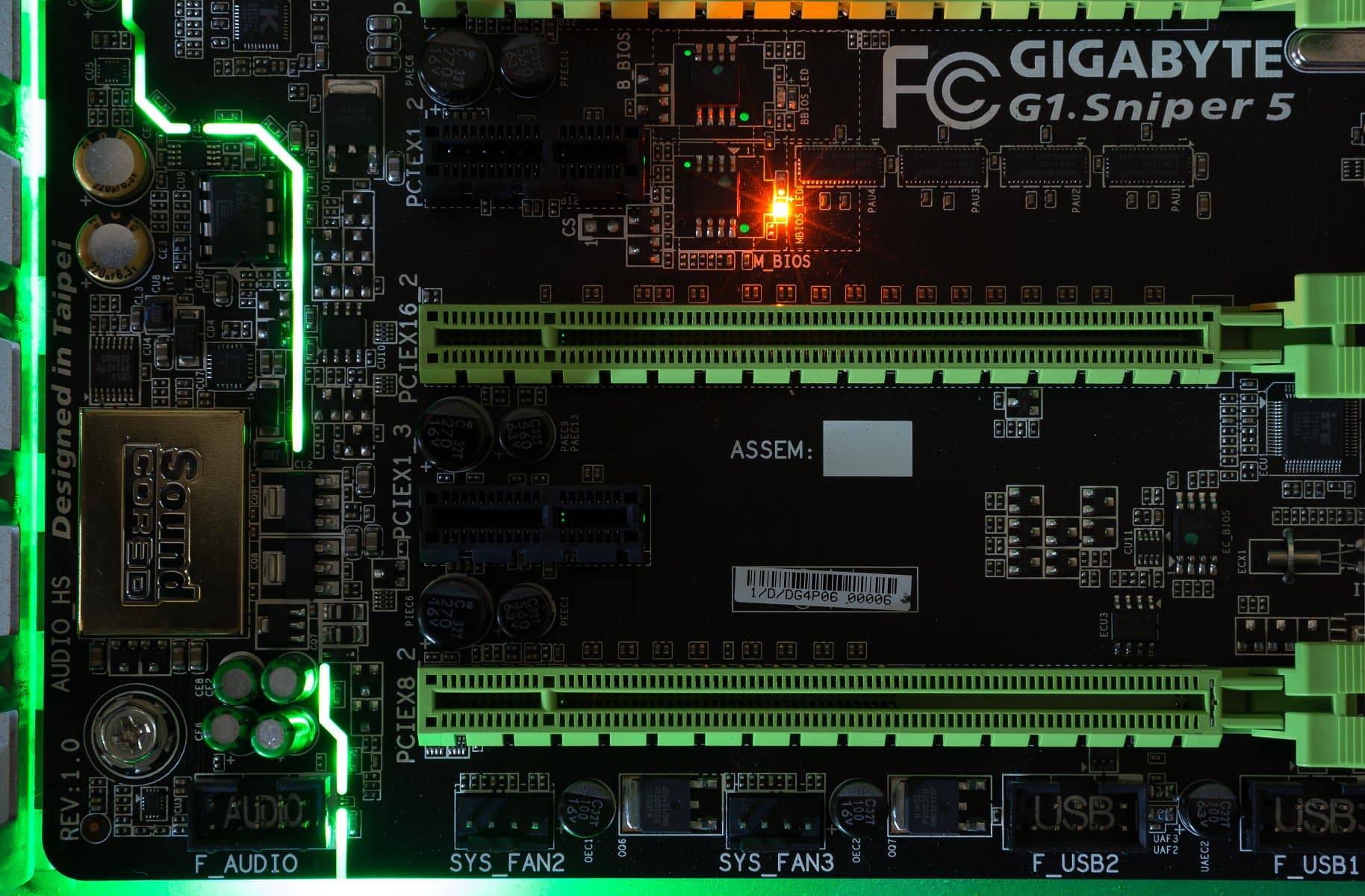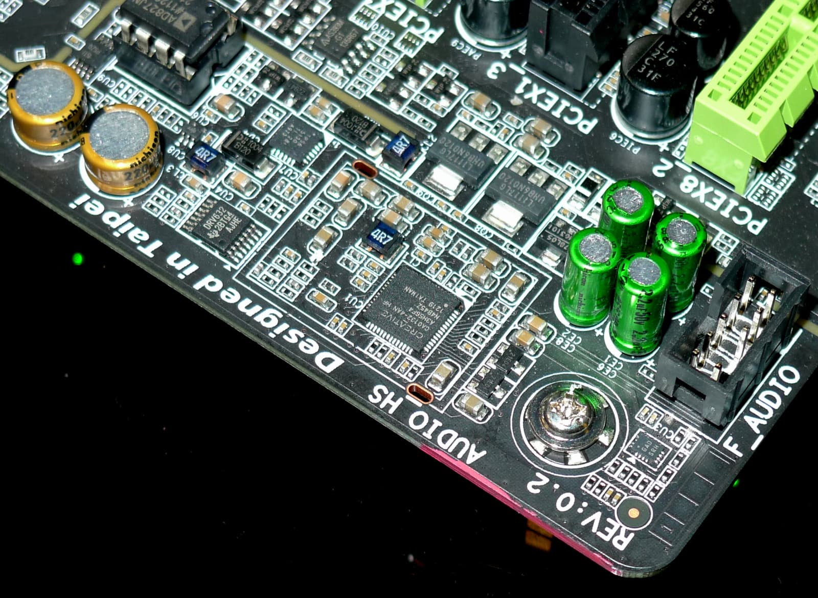 Как известно, монтаж элементов на материнской плате очень плотный, и разместить на стандартном месте что-либо кроме звукового кодека очень сложно. Тем не менее разработчики материнской платы Gigabyte G1.Sniper 5 отнеслись к делу ответственно и выделили целый кусок печатной платы под звуковые цепи. Мало того, сделаны отдельные фильтры питания и отдельная аналоговая цепь со сменным операционным усилителем и аудиофильскими электролитами Nichicon. Также применен отдельный мощный усилитель для наушников с поддержкой импеданса до 600 Ом на основе линейного драйвера TI DRV632.