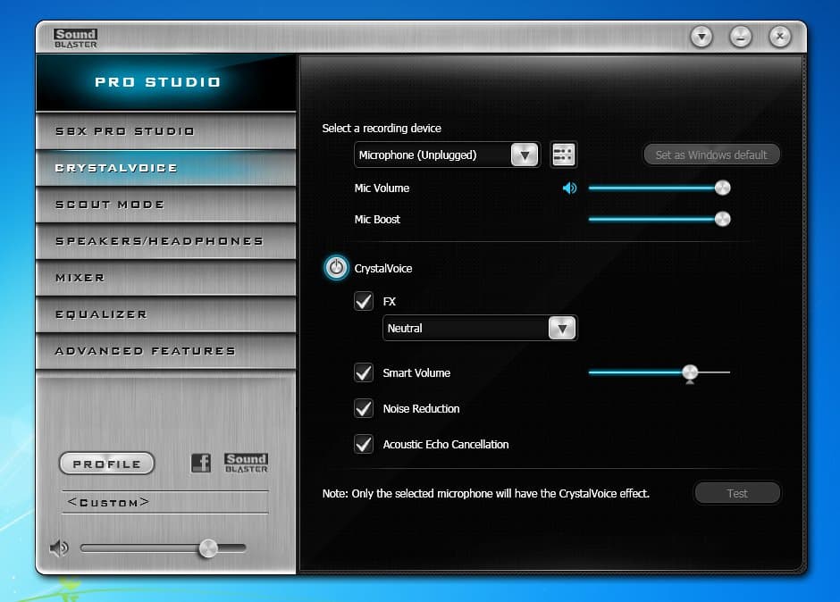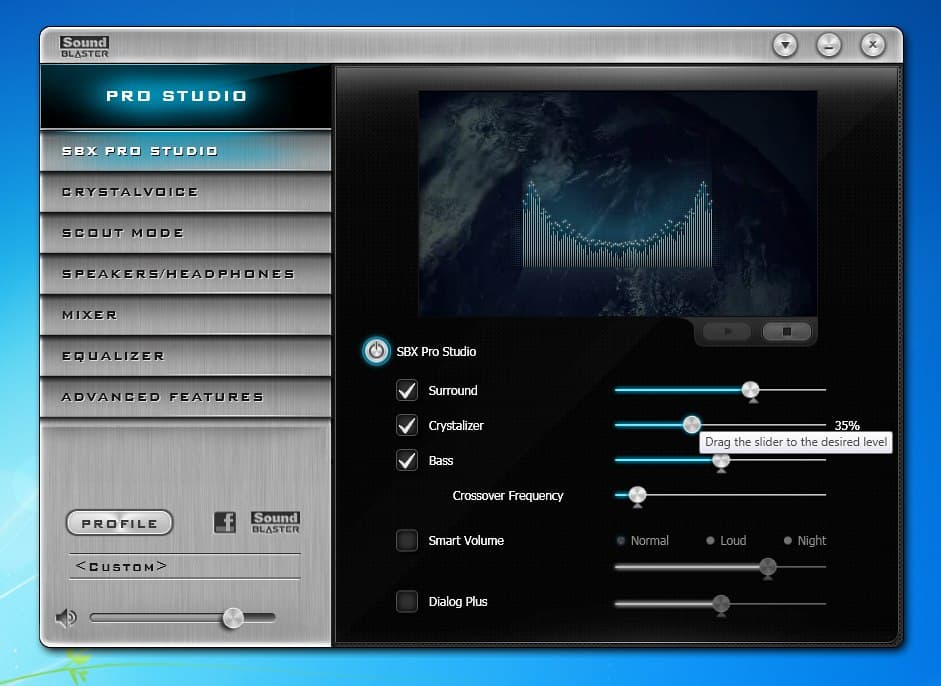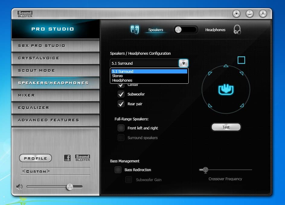 Программная составляющая полностью аналогична звуковым картам Creative последнего поколения, только вместо красного цвета панели выбран синий. Также, в отличие от звуковых карт, в драйверах пока что нет руссификации. Это не очень большое упущение, так как в русском интерфейсе не будет таких красивых кастомных шрифтов.