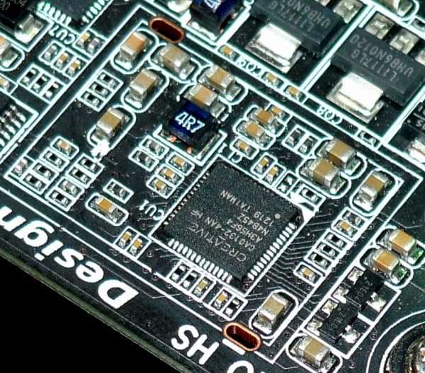 Под кожухом находится процессор SoundCore3D, Creative CA0132. На других материнских платах такого кожуха может и не быть. В теории кожух может также предохранять от электромагнитных помех, но на практике реальную опасность представляют только помехи по цепям питания и плохая разводка земли. Те самые треск и высокочастотный писк, которые преследуют интегрированный звук, образуются в первую очередь из-за возврата в цепь питания помех от ШИМ-стабилизаторов материнской платы. Для борьбы с этим явлением в Gigabyte применили агрессивную активную фильтрацию в регулируемых стабилизаторах напряжения L1117LG, которые снижают импульсные составляющие в цепях питания более чем на 65 дБ.