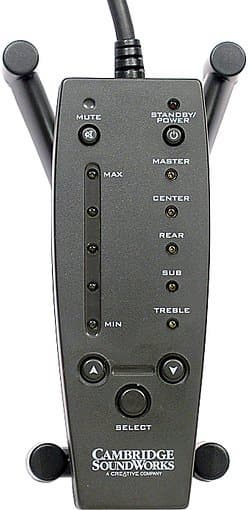 Пульт дистанционного управления в этом наборе – проводной. Длина провода, соединяющего пульт с сабвуфером, составляет 2,5 метра. Для пульта также предусмотрена специальная подставочка, выдержанная в одном стиле с набором.