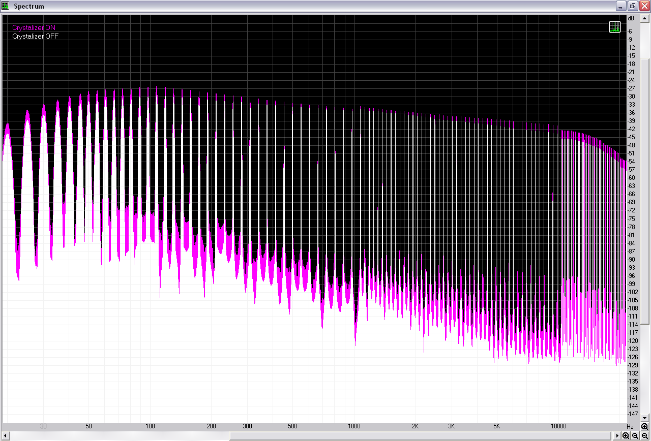 Однако, даже на статическом синусоидальном мультитоновом сигнале продолжительностью несколько секунд Crystalizer значительно эквализует сигнал, увеличивая RMS громкость сигнала примерно на 3 дБ.