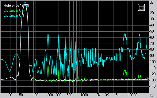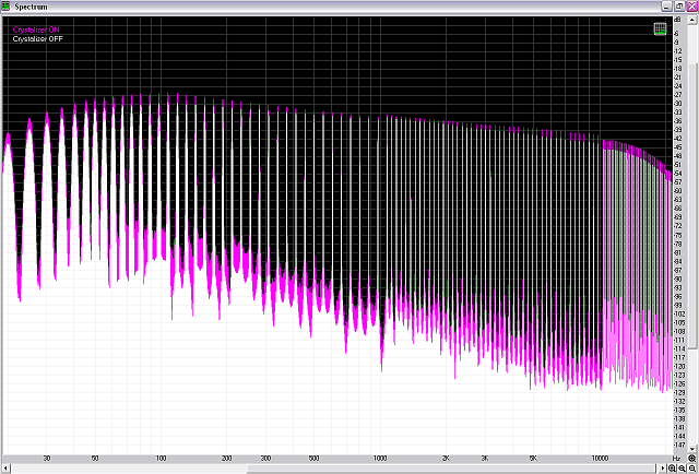 Как мы видим, Crystalizer не только не расширяет динамический диапазон 16-битного сигнала, но даже уменьшает его. В положении по умолчанию (50%) Crystalizer усиливает сигнал так, что две синусоиды 60 Hz @ -5 dB и 7000 Hz @ -17 dB (стандартный сигнал теста SMPTE-IMD) вызывают около 1% искажений (IMD+Noise). Последнее никак не может сделать звук более чистым и кристальным. Как вы можете это прокомментировать?