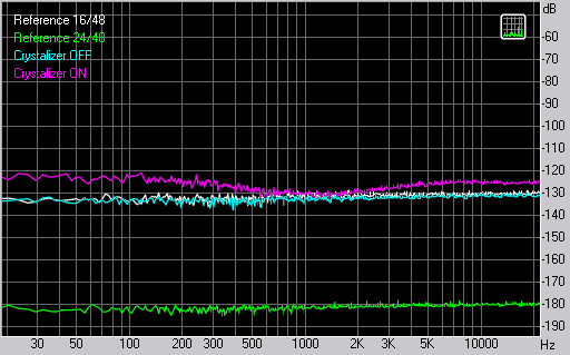 Реклама Creative говорит, что Crystalizer расширяет динамический диапазон 16-битных записей до 24 бит. Я провёл в RMAA 5.5 эксперимент — проигрывал 16-битные и 24-битные WAV файлы на X-Fi и записывал результат с аналогового и S/PDIF-выходов (результаты одинаковы) на профессиональном звуковом интерфейсе LynxTwo-B в 24-битном режиме, при включенном и выключенном Crystalizer. Результаты сравнивали с референсными WAV файлами 16 и 24 бит, которые используются в тесте и которые просто генерились программой без проигрывания через что-либо.