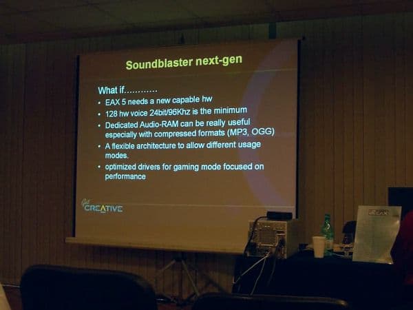 Так, новейший DOOM3 содержал альтернативный программный звуковой движок с грандиозными замыслами победить все существующие движки, реализованными едва ли на десятую часть, с семплами не самого высокого качества, сжатыми в формат OGG, и распаковываемыми на лету в PCM для микширования и воспроизведения. Creative не устраивала ситуация, когда мировой бестселлер не использовал не то что новейшие расширения EAX, но и даже аппаратный DirectSound, что позволило бы применить качественные алгоритмы 3D звука. Более того, никакой разницы между интегрированным звуком и новейшими картами Creative не было ни в качестве, ни в производительности.