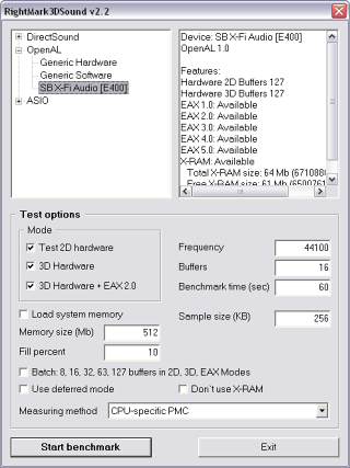 Обладатели X-Fi c X-RAM при желании могут повторить наш эксперимент. Напомню, необходимо перевести X-Fi в Game Mode и выбрать в тесте устройство X-Fi в списке OpenAL устройств системы.