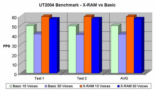 Тестирование показало, что изменение количества буферов, размера и включение загрузки памяти для эмуляции нагрузки на шину процессор-память не выявляют заметных преимуществ применения X-RAM. На процессоре P4 3.4 ГГц уменьшение загрузки CPU от включения X-RAM составляет 0,1%. Тогда как изменение количества буферов адекватно в разы изменяет загрузку процессора.