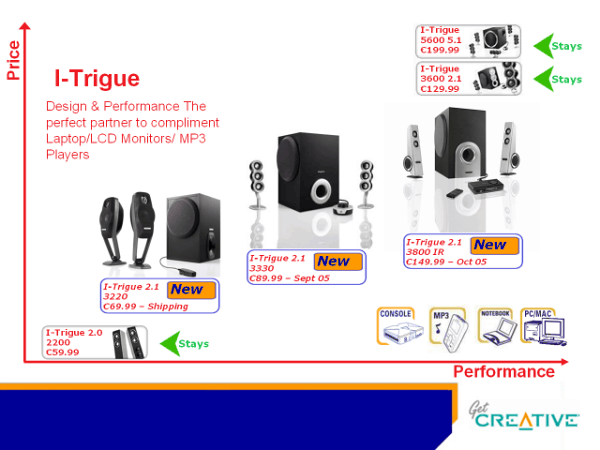 Линейка "интригующих" колонок i-Trigue позиционируется для пользователей ноутбуков, LCD мониторов, MP3-плееров и игровых консолей.
