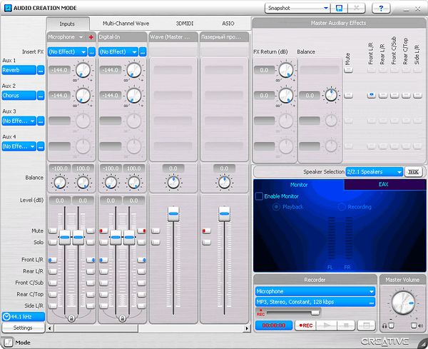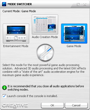 Карты семейства X-Fi имеют три режима работы: развлекательный, игровой и создание музыки. Режимы переключаются в утилите Mode Switcher.