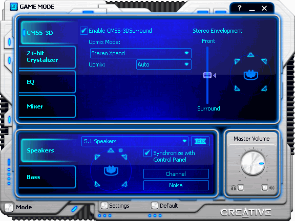 Технология CMSS (Creative Multi Speaker Surround) обновлена до CMSS-3D. Производитель заявляет, что качество звукового поля выше, чем у Dolby Prologic II/IIx, а в наушниках пространственность и натуральность тембров на ВЧ превосходит Dolby Headphone.