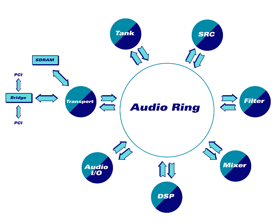 Для соединения с цифровыми и аналоговыми интерфейсами процессор имеет 4 входных/выходных шины I2S, обеспечивая 8 входных и 8 выходных каналов. Помимо этого, имеется проприетарный протокол для передачи 8 каналов по одному проводу, таким образом получается 32 х 48 кГц, 16 х 96 кГц, 8 х 192 кГц каналов. Для внутренних нужд и роутинга имеется 4096 звуковых и 4096 параметрических каналов.