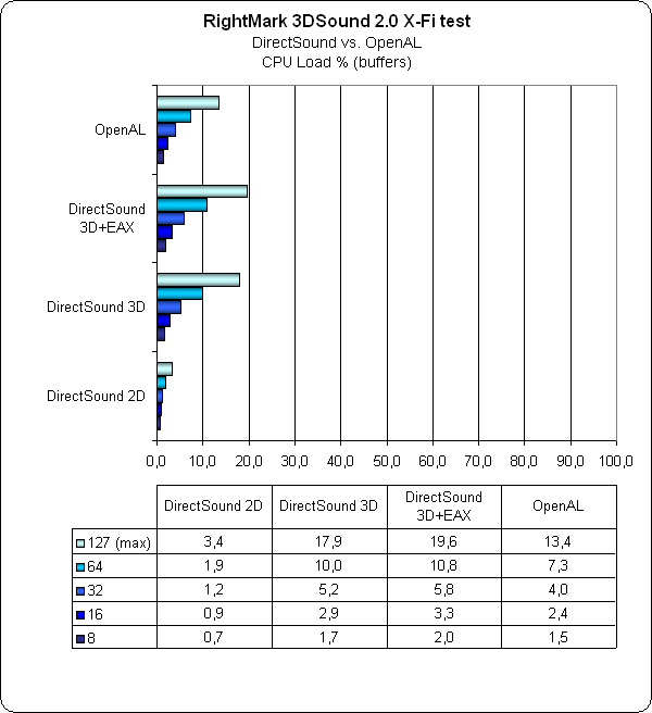 Диаграмма умышленно построена в масштабе 100%, чтобы показать — разница, даже в несколько раз, при малом количестве буферов несущественна, а включение EAX в режиме 3D обходится практически бесплатно.