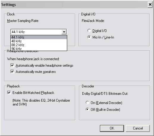 X-Fi HW SRC OFF — отключение аппаратного SRC у X-Fi достигнуто путем установки опорного режима 44,1 кГц и опции Enable Bit-Matched Playback.