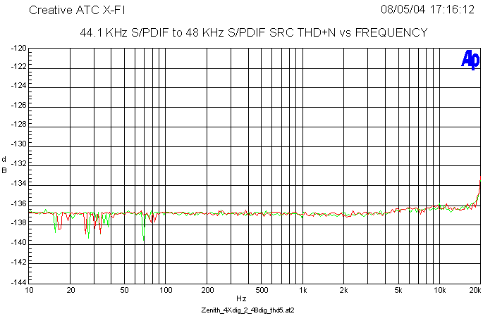При конвертации стандартного тона 997 Гц из 44.1 кГц в 48 кГц стандартный параметр, отвечающий за мощность шумов и искажений, THD+N равен -136 дБ, дрожание частоты в полосе пропускания ±0.00025 дБ. Проверять эти параметры Creative рекомендует как минимум с помощью измерительной станции AudioPrecision.