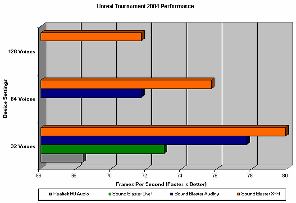 Как уже упоминалось, Creative имел возможность протестировать X-Fi на специальной версии UT2004 с поддержкой 128 голосов. Не могу не привести результаты: