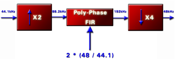 Картинка иллюстрирует работу SRC X-Fi по конвертации 44.1 кГц в 48 кГц. Сперва отсчеты сигнала удваиваются до 88.2 кГц. Полифазный КИХ фильтр конвертирует сигнал до 192 кГц с коэффициентом, равным удвоенному отношению 48/44.1. В финальной стадии частота уменьшается до 48 кГц. Такая схема более эффективна с точки зрения вычислительных затрат и даёт более качественный результат, так как на последнем этапе не образуется алиазинг из-за некратных частот.