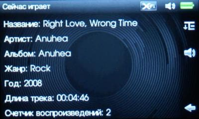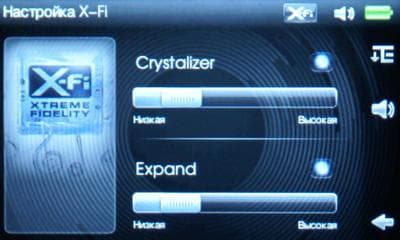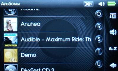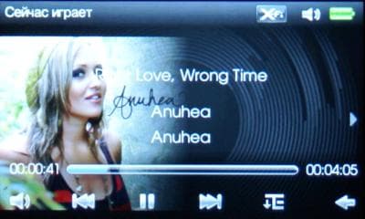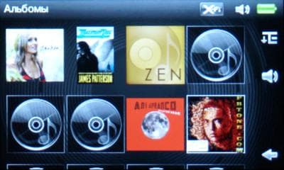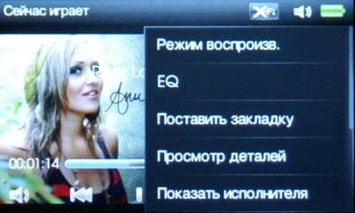 Дисплей во время воспроизведения почти не содержит информации — отображаются только имя исполнителя, название альбома и песни, кнопка включения X-Fi, заряд батареи, пиктограмма эквалайзера. Если же коснуться экрана, то на короткое (даже слишком короткое) время снизу выезжает панель кнопок: для регулировки громкости, перемотки, установки паузы, возврата на предыдущий уровень, вызова опций. В связи с такой особенностью не очень удобно управлять громкостью: надо вызвать панель, нажать на нужную кнопку, затем двигать сенсорный ползунок громкости. Разумеется, здесь и не пахнет «слепым» управлением.