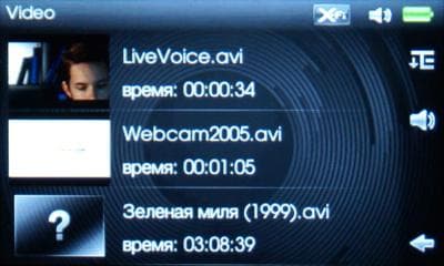 Плеер поддерживает следующие форматы видео: WMV9, MPEG4-SP, DivX4/5, XviD. В Zen X-Fi было ограничено разрешение — до 320 * 240 точек, новинка же справляется и с видео с 720-ю точками по длинной стороне. Поток 3 Мбит девайсом уже не читается, совсем, — файлы просто не открываются. Оптимальный поток для плеера — 1Мбит. Поддерживаются звуковые дорожки только в формате MP3. Плеер «видит» только файлы AVI и WMV. К сожалению, не поддерживается кодек H.264 и контейнер MP4, столь популярныe сегодня.