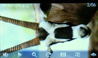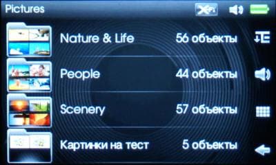 С помощью данного девайса вы можете просматривать картинки двух популярных форматов — JPEG и BMP. Браузер фотографий очень удобен, по маленькому изображению можно быстро найти нужную картинку. Даже очень большие картинки открываются довольно быстро. Просмотрщик умеет поворачивать фотографии с шагом в 90 градусов, увеличивать и, разумеется, затем позволяет скользить по увеличенной картинке. Также можно просмотреть информацию о файле (дату съемки, размер файла и габариты) и установить любой снимок в качестве фонового изображения для меню плеера. Просмотр фото может сопровождаться музыкой, но управлять проигрывателем не получится — только громкостью.