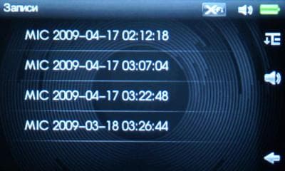 Плеер способен записывать звук со встроенного микрофона. Никаких настроек не предусмотрено, запись производится в WAV ADPCM, с битрейтом 64 Кбит/с и частотой 16 КГц. Таких показателей хватит, чтобы смело использовать устройство для записи интервью и голосовых заметок. Но на «дальнобойность» рассчитывать не стоит. Хорошо, что имя записанного файла не просто порядковый номер, оно осмысленно. Для примера — MIC-2009-03-18_03h26m44s.WAV