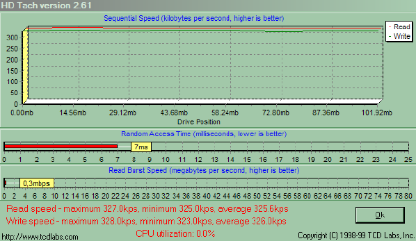 А вот это — результат тестирования карты CompactFlash (для любознательных — это была карта емкостью 512 Мбайт от PQI серии Q6):