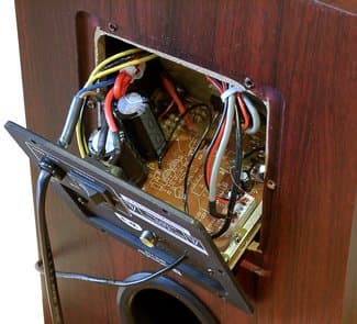 Акустическим оформлением колонок является схема с фазоинвертором. Отверстие ФИ выведено на заднюю панель. Длина трубы фазоинвертора составляет 16 сантиметров, диаметр отверстия — 5 сантиметров. Толщина стенок, изготовленных из фибролита, равна 13 миллиметров. Внутри корпуса никакого наполнителя нет. Соединение динамиков осуществлено через кроссовер, выполненный из двух фильтров первого и второго порядка. Платка кроссовера расположена внутри корпуса на нижней панели и обильно залита клеем.