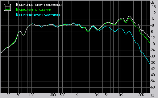 Регулятор уровня высоких частот начинает работу уже в области средних частот и к 20 кГц диапазон подавления составляет 16 дБ. Как мы видим из измерений, высокие частоты в основном можно только уменьшить. Амплитуда сигнала в положении ручки от центра до максимума отличается, в лучшем случае, в 2 дБ.