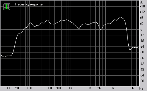 График АЧХ имеет достаточно изрезанный вид. Рабочий диапазон в нижнем регистре уверенно начинается с 70 Гц. В целом, уровень искажений средний, однако в среднечастотной области в районе 300 Гц наблюдаются паразитные призвуки.