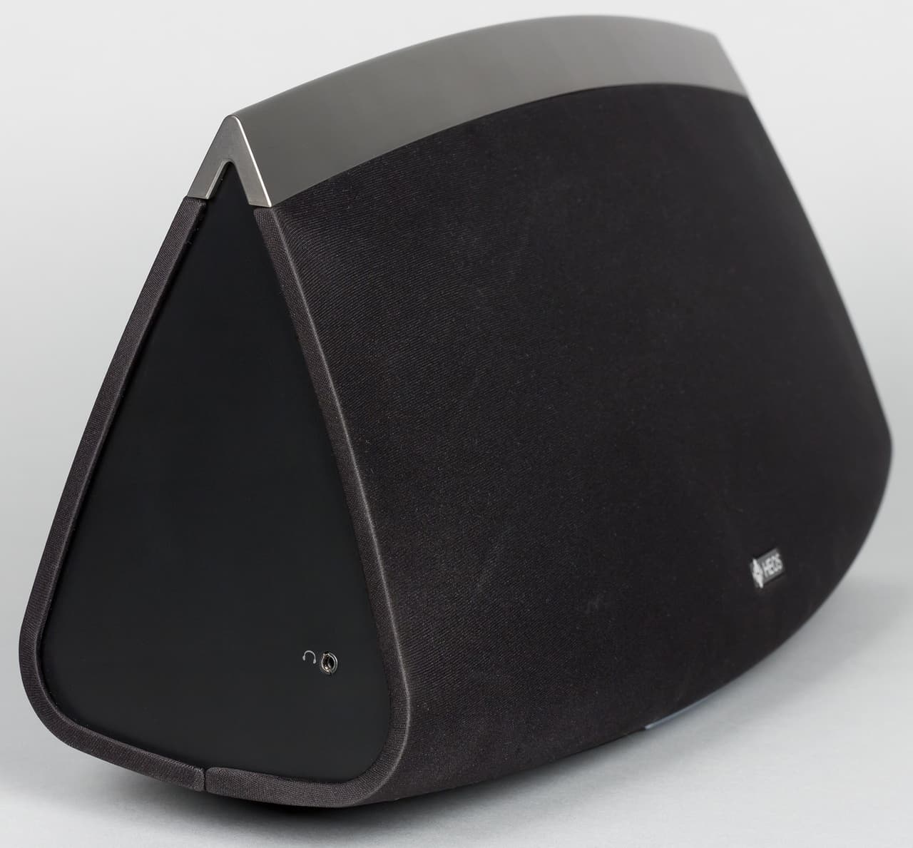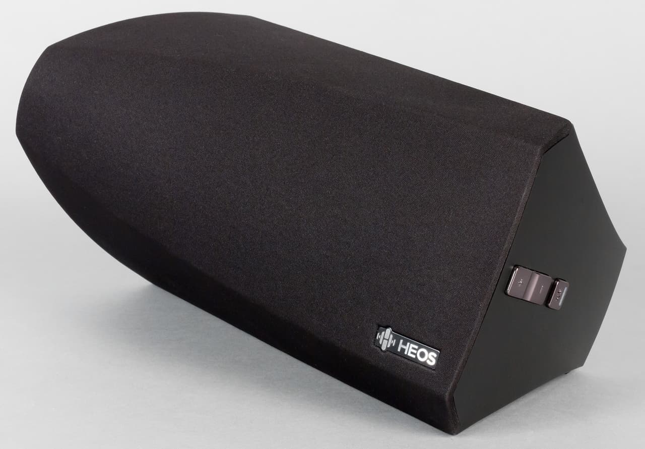 Heos 5 рассчитана уже только на горизонтальную установку. Ее корпус имеет габариты примерно 30×21×17 сантиметров. Форма в проекции близка к треугольнику. Нижняя часть и торцы выполнены из пластика, сверху все закрыто сеткой из ткани.