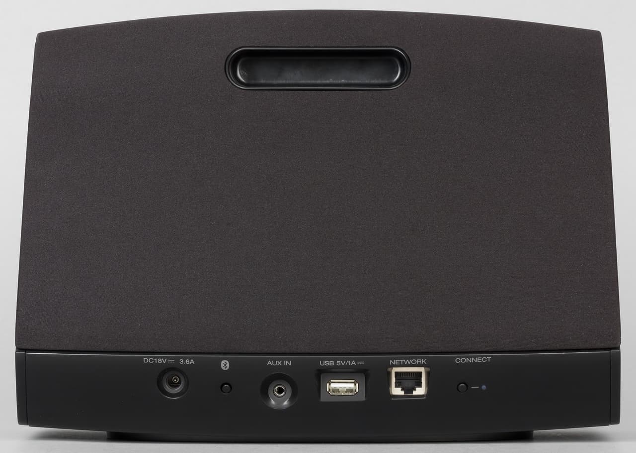 Сзади есть отверстие для настенного крепления, порт USB для накопителей (или зарядки смартфонов) и ниша с остальными портами и органами управления — кнопка подключения по Bluetooth и сброса, вход блока питания, аналоговый аудиовход, сетевой порт, кнопка и индикатор для подключения к Wi-Fi.