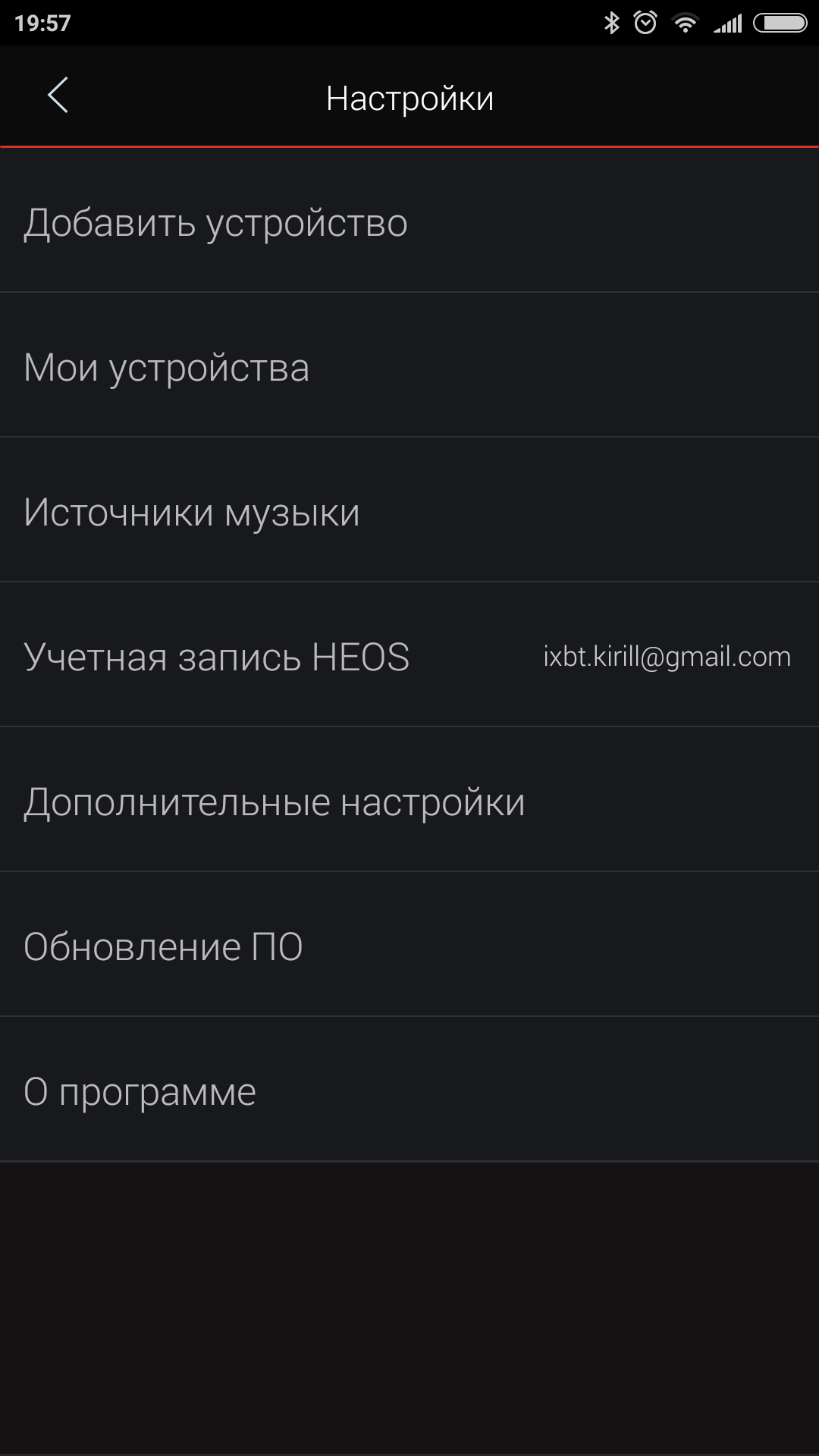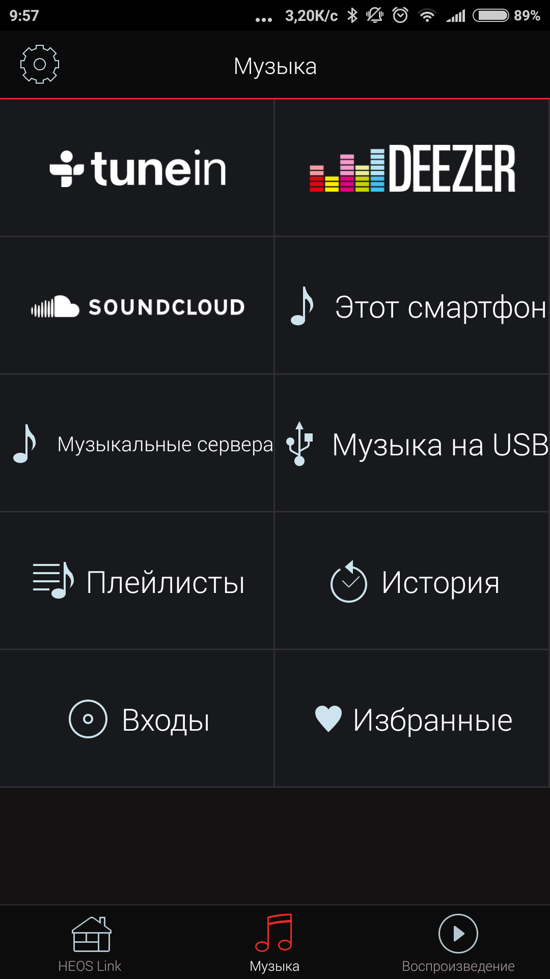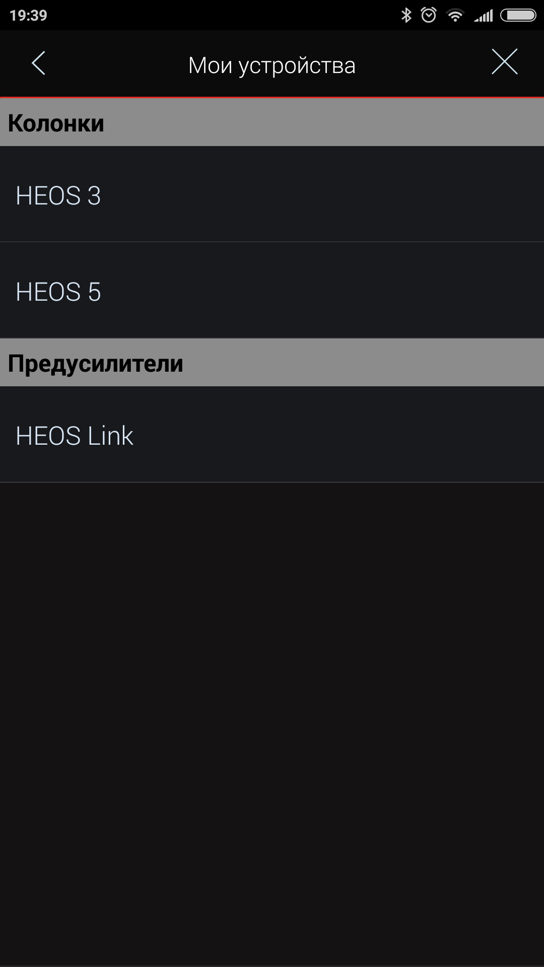 В верхнем левом углу этого окна есть знак шестеренки, который предназначен для вызова меню настроек системы, описанного выше. В нем есть такие пункты как добавление нового устройства, настройки источников звука (в частности сервисов и локальных аудиовходов), учетная запись Heos, обновление ПО и сервисы диагностики. Параметры каждой колонки выбираются через пункт «Мои устройства».