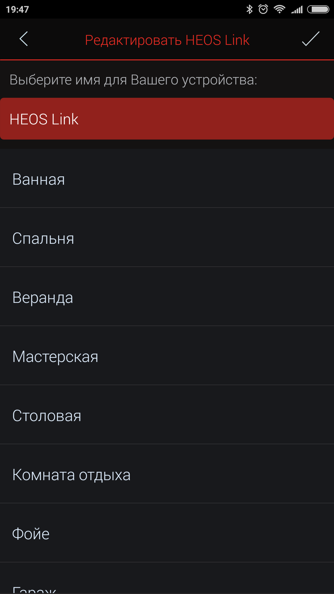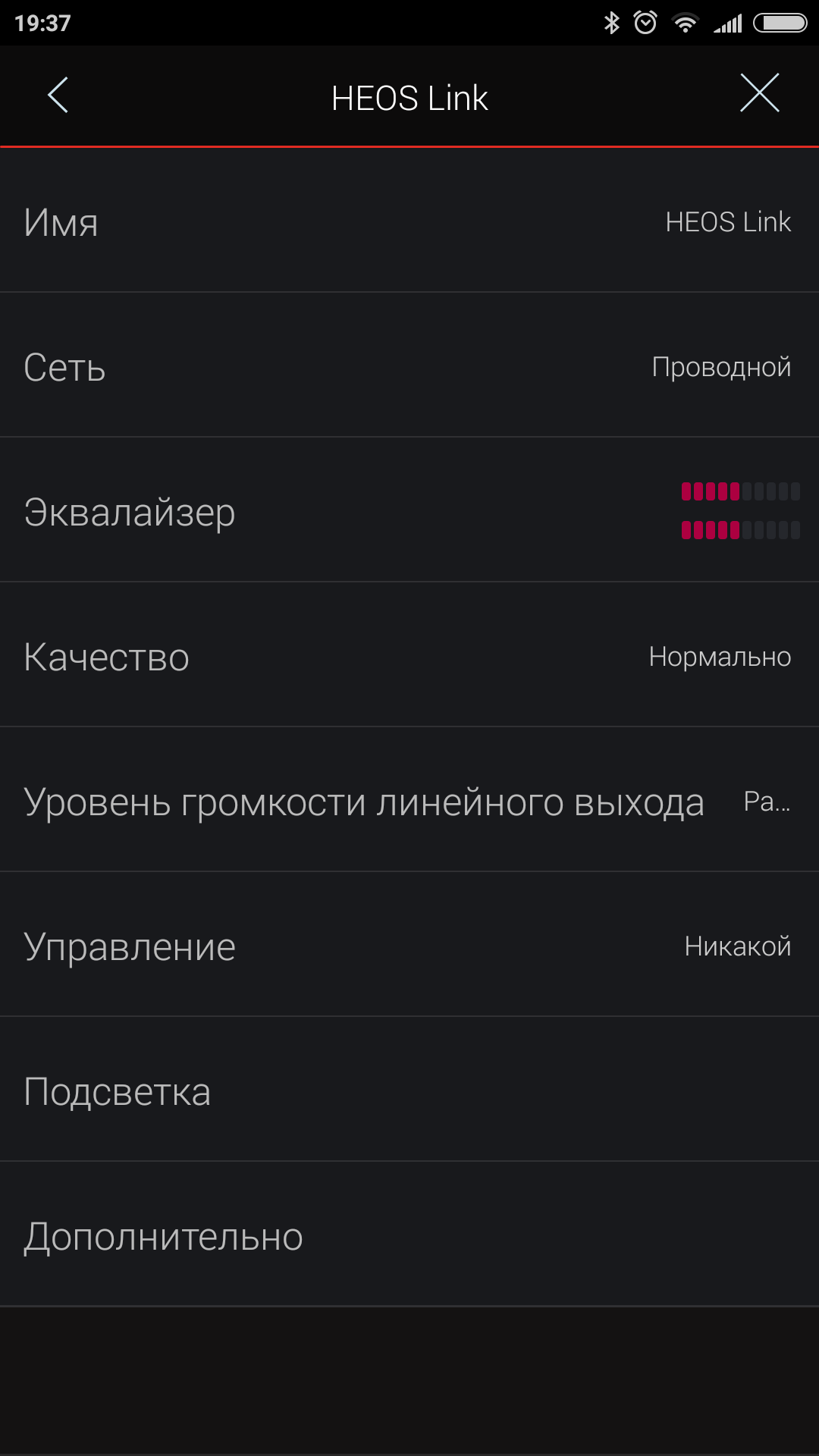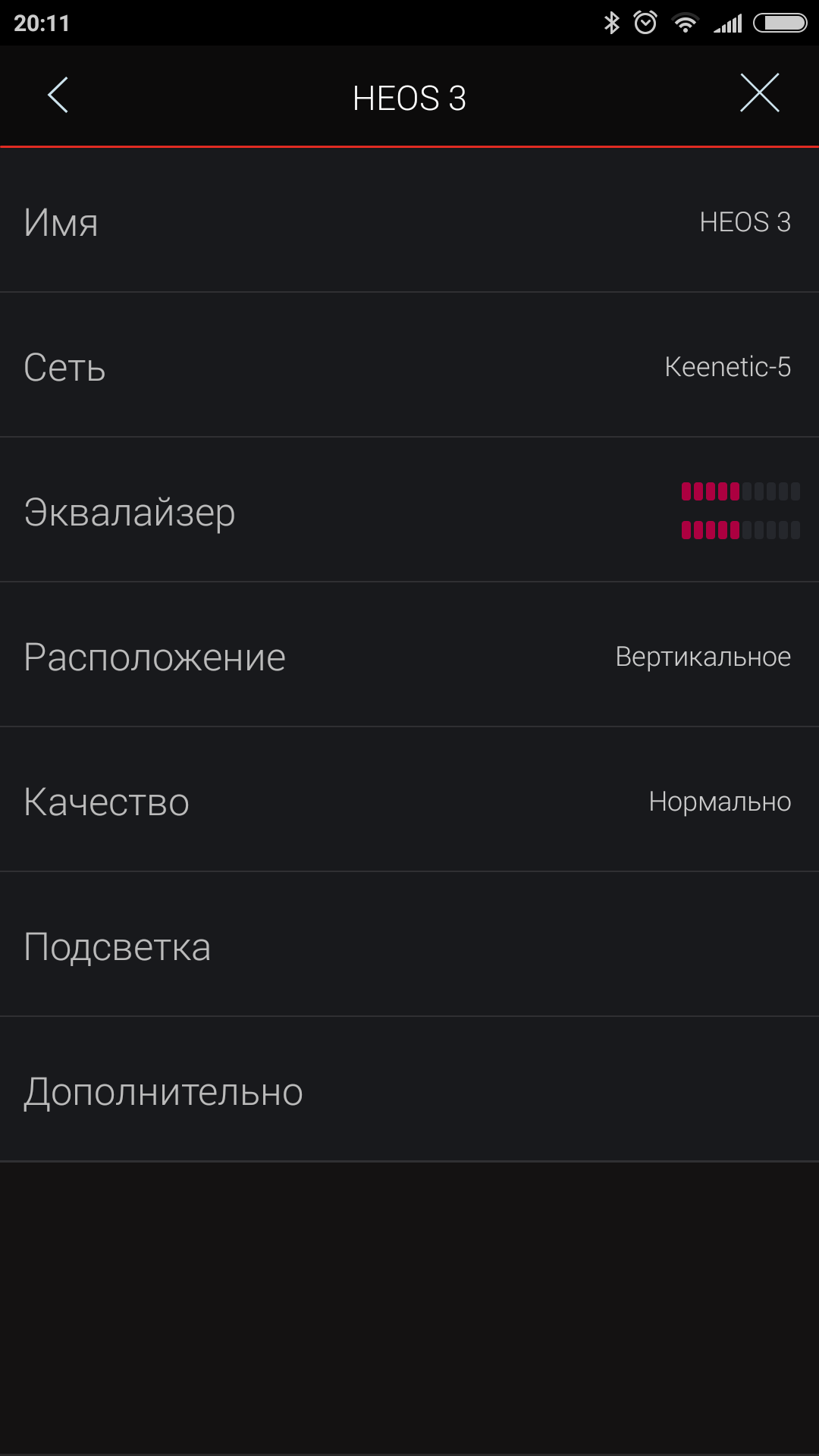Основные общие для всех моделей настройки включают в себя: выбор имени, параметры сетевого подключения, эквалайзер (раздельная регулировка ВЧ и НЧ), качество оцифровки с линейного входа, выбор яркости подсветки. Для Heos 3 дополнительно есть пункт выбора варианта установки колонки — вертикального или горизонтального. Для Heos Link можно выбрать режим работы сигнала на выходе, а также параметры управления внешним устройством (ресивером или усилителем).